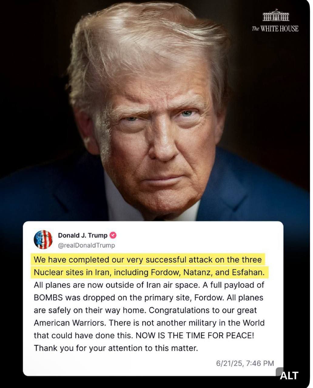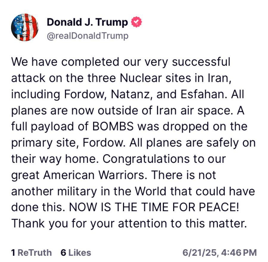 ما حمله بسیار موفقیت‌آمیز خود را به سه سایت هسته‌ای ایران، شامل فردو، نطنز و اصفهان، تکمیل کردیم. اکنون همه هواپیماها از حریم هوایی ایران خارج شده‌اند. یک محموله کامل بمب بر روی سایت اصلی، فردو، انداخته شد. همه هواپیماها در راه بازگشت به خانه هستند. به رزمندگان بزرگ آمریکایی‌مان تبریک می‌گوییم. هیچ ارتش دیگری در جهان نمی‌تواند این کار را انجام دهد. اکنون زمان صلح است.