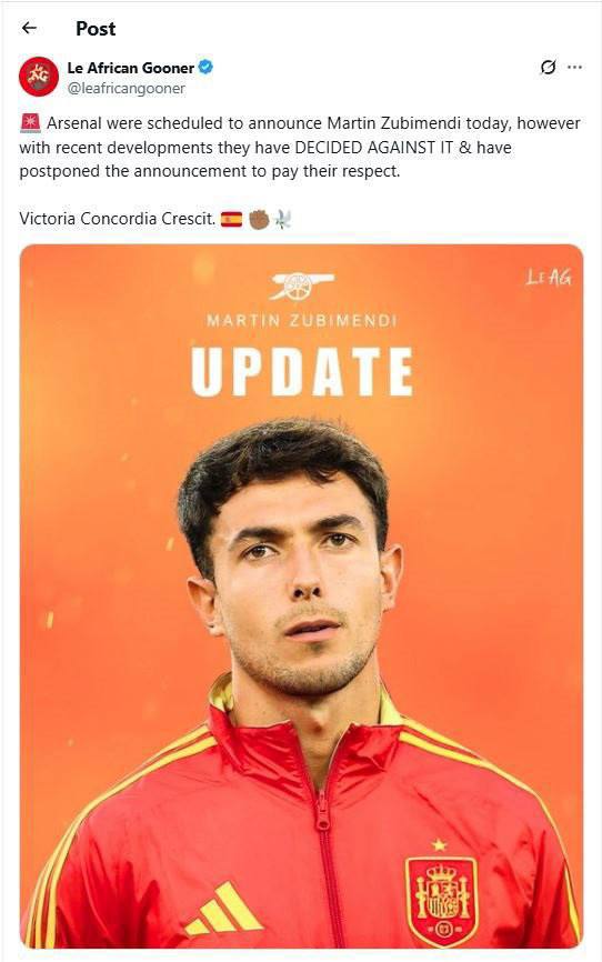 در اقدامی تحسینبرانگیز، باشگاه آرسنال مراسم رونمایی از خرید جدید خود، مارتین زوبیمندی، را به احترام درگذشت دیوگو ژوتا به تعویق انداخت.