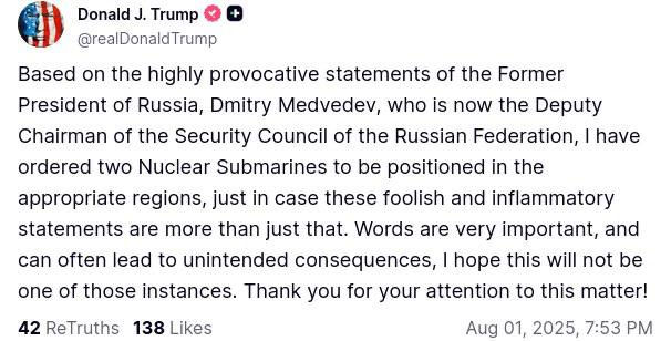 بر اساس اظهارات بسیار تحریک‌آمیز رئیس‌جمهور سابق روسیه، من دستور داده‌ام دو زیردریایی اتمی در مناطق مربوطه مستقر شوند ، در صورتی که این اظهارات احمقانه و تحریک‌آمیز چیزی فراتر از صرفاً کلمات باشند.