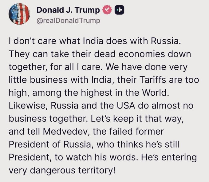 دونالد ترامپ، رئیس‌جمهور ایالات متحده آمریکا، در واکنش به اظهارات تهدیدآمیز دیمیتری مدودف، معاون رئیس شورای امنیت روسیه، پستی صریح و هشدارآمیز در پلتفرم Truth Social منتشر کرد.
